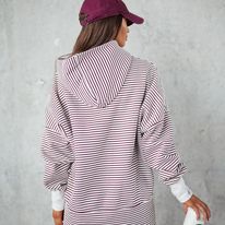 Bluza w bordowe paski z kapturem. Długi  rękaw zakończony ściągaczem z wycięciem na kciuka. Przód krótszy, tył dłuższy, po bokach znajdują się rozstrzelenia. Bluza doskonale sprawdzi się w codziennych stylizacjach w chłodniejsze dni.