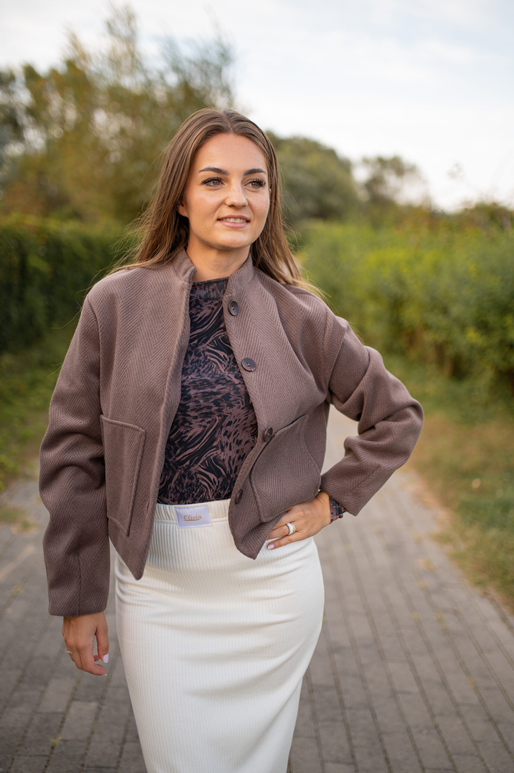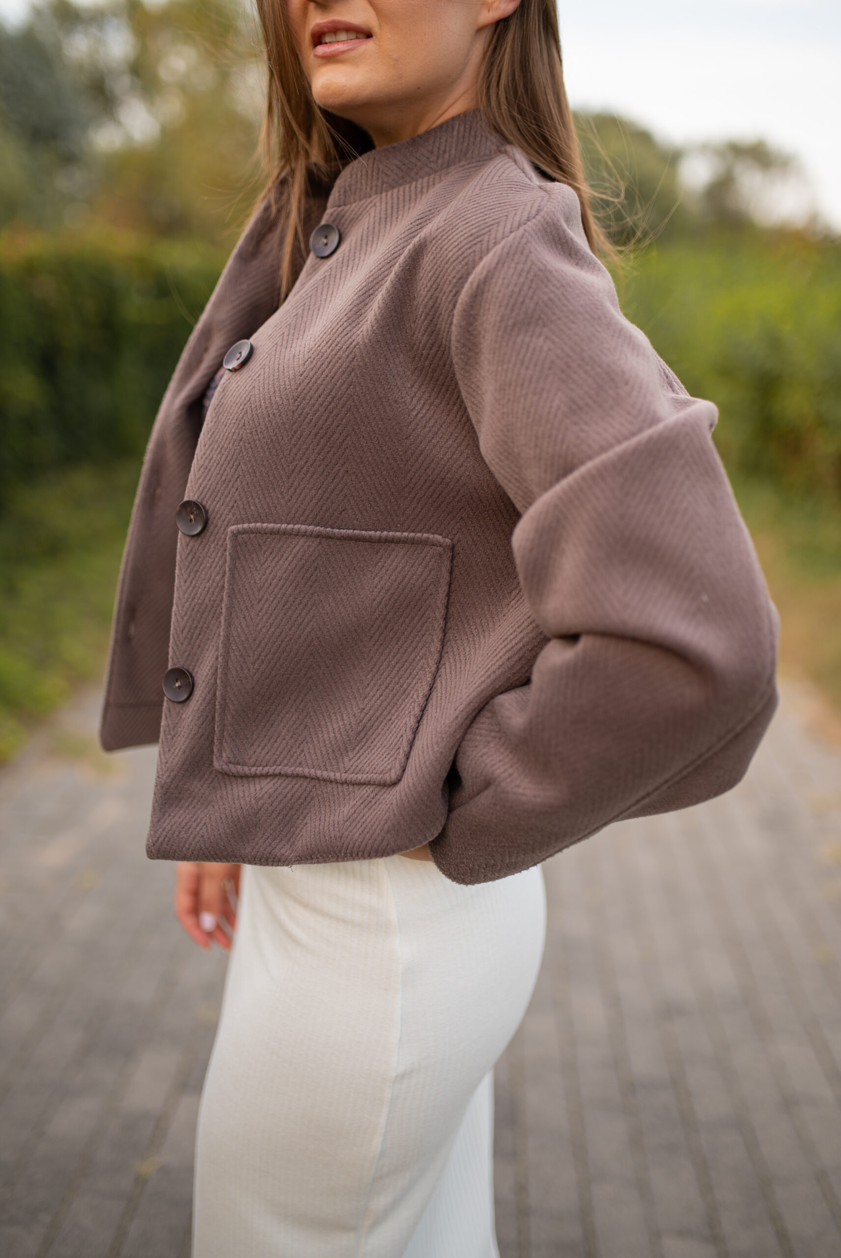 Bomberka w jodełkę, w kolorze brązowym. Posiada podszewkę i naszywane kieszenie z przodu. Model zapinany na guziki, góra wykończona stójką. Tył bomberki wyposażony jest w gumkę, co sprawia lepsze dopasowanie do sylwetki. Bomberka sprawdzi się w każdej stylizacji.