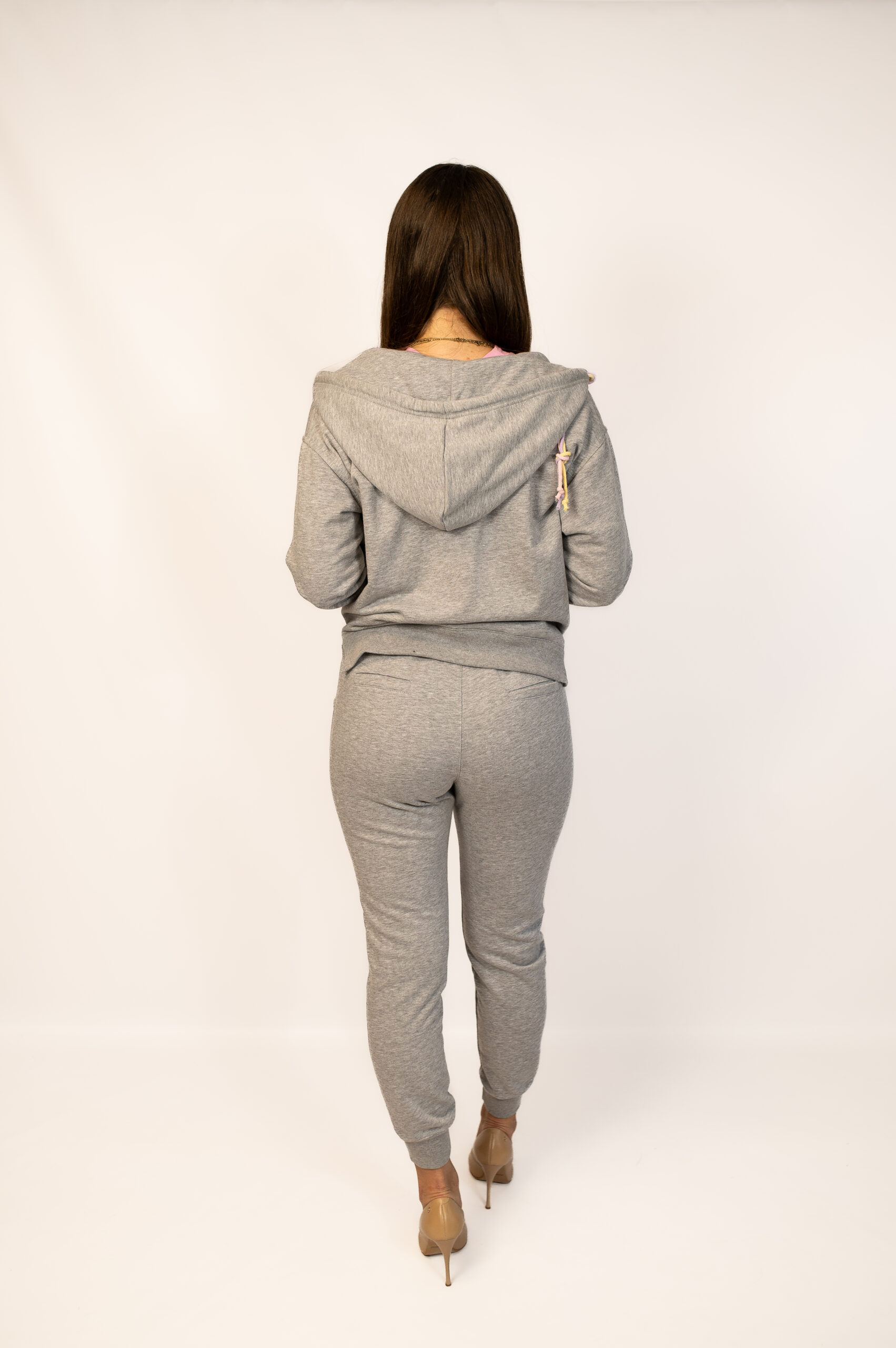 Bawełniany komplet dresowy składający się rozpinanej bluzy z kapturem oraz spodni. Bluza zapinana na zamek, z kieszeniami, przy kapturze kolorowe troczki. Spodnie długie zakończone ścigaczem, z kieszeniami na bokach, w pasie gumka i troczek do regulacji. Bardzo wygodny zestaw do codziennego użytku.