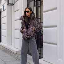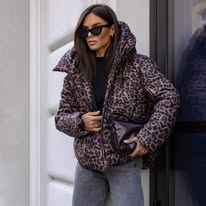 Asymetryczna, luźna kurtka w panterowy print. Zapinana na zamek, po bokach znajdują się pojemne kieszenie. Kurtka posiada obszerny kaptur i gumki po bokach do regulacji. Model ten sprawdzi się doskonale w chłodne dni.