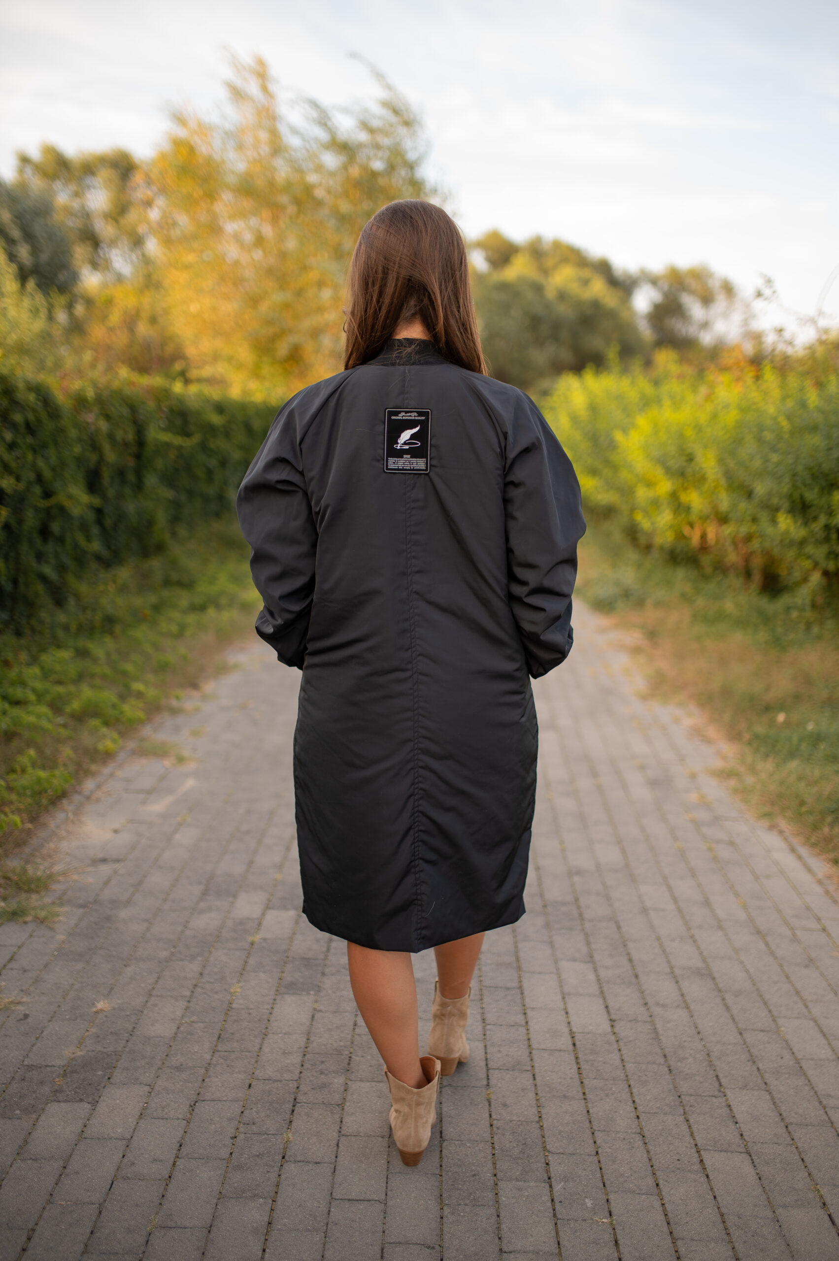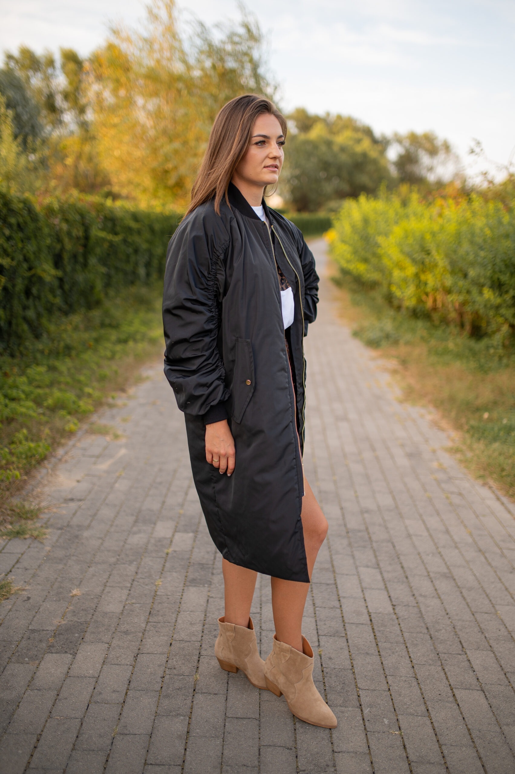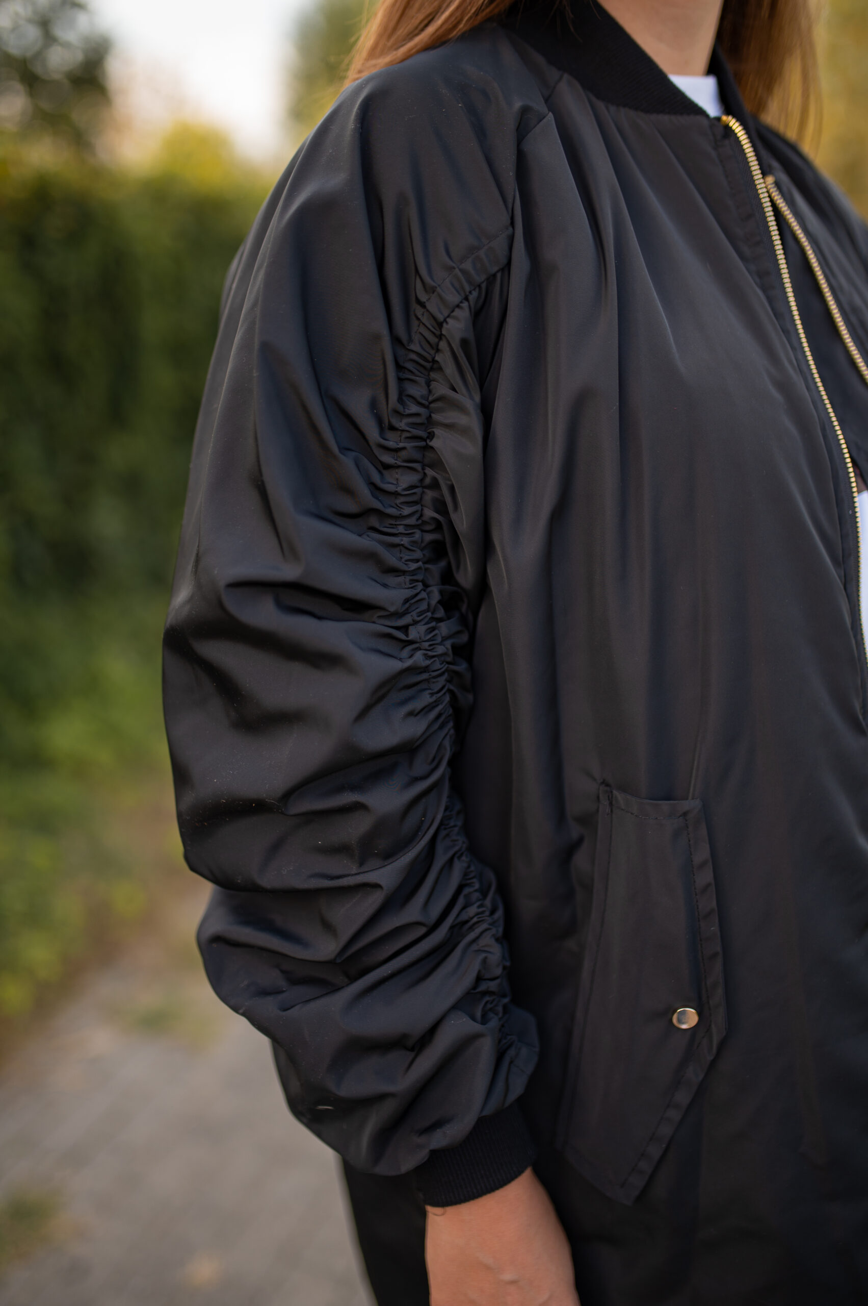 Płaszcz z ortalionu, doskonała propozycja na jesień. Zapinany na zamek, po bokach znajdują się dwie kieszenie, zapinane na napy. Rękawy zdobi marszczenie z gumki, zakończone ściągaczem. Kurtka posiada podszewkę i ocieplenie. Model oversizowy.