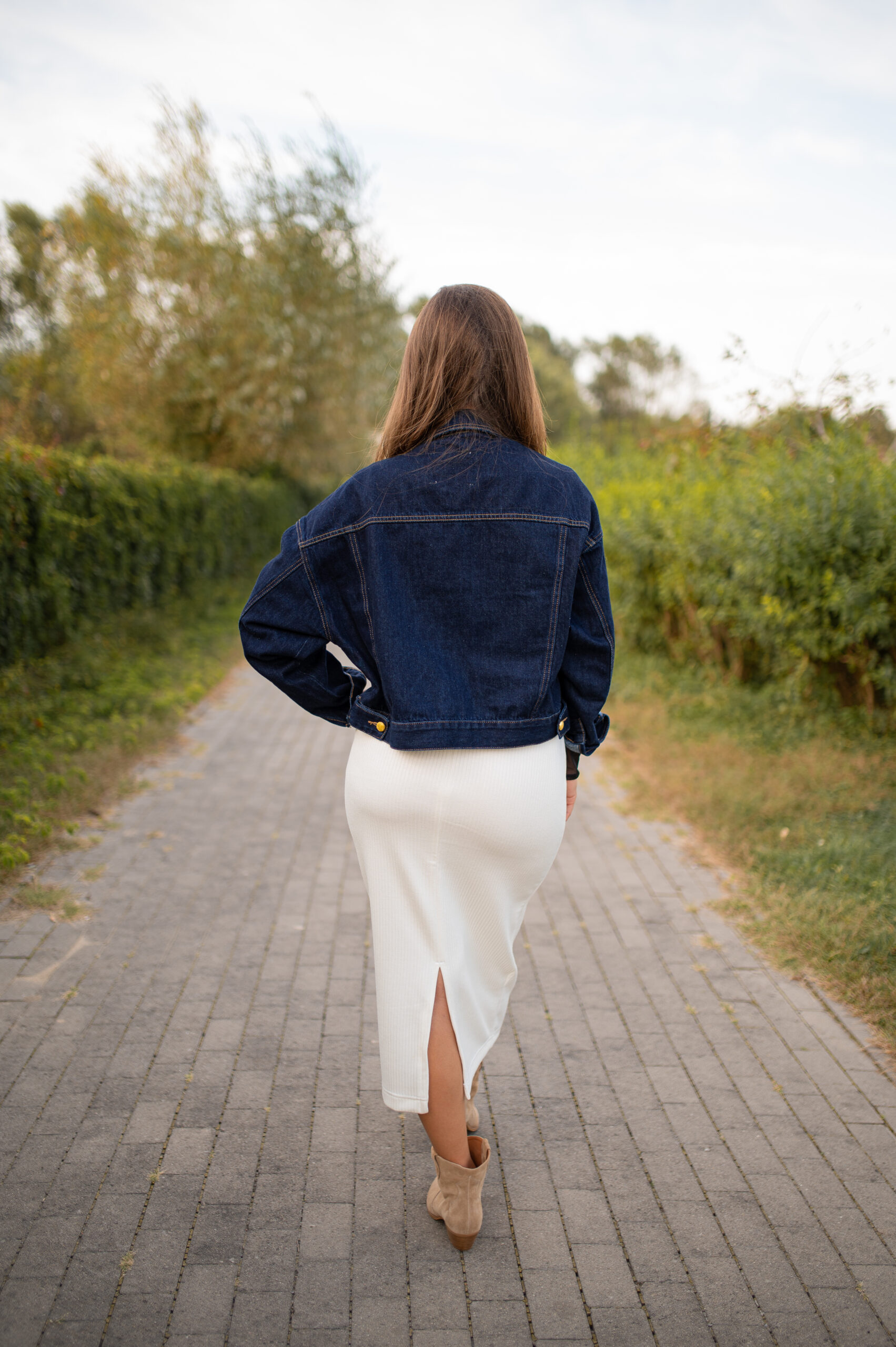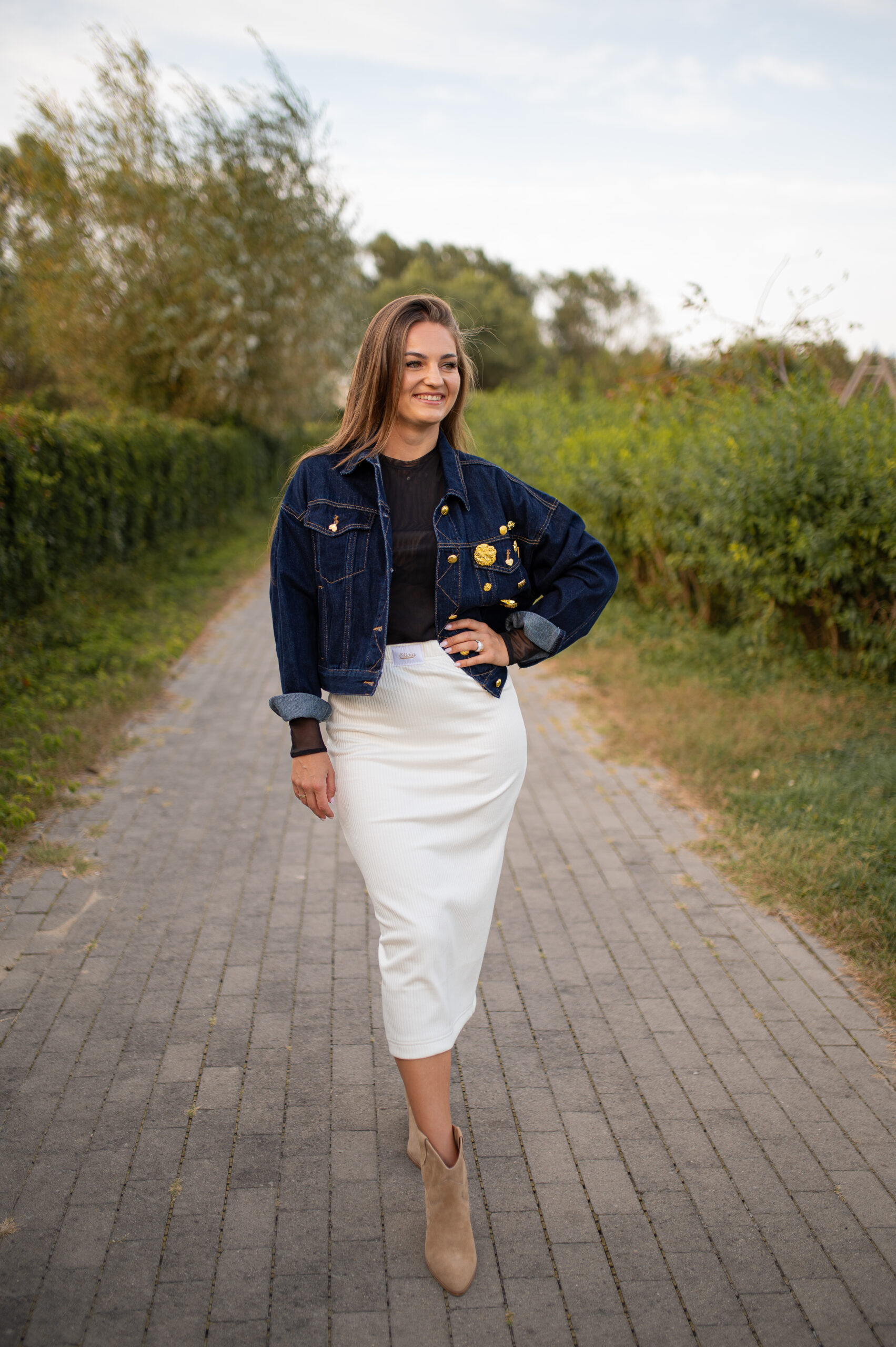 Śmietankowa, prosta spódnica. Długośc midi. Posiada gumkę w pasie co ułatwia dopasowanie do sylwetki. Z tyłu rozcięcie. Sprawdzi się doskonale w sportowych stylizacjach jak casualowych.