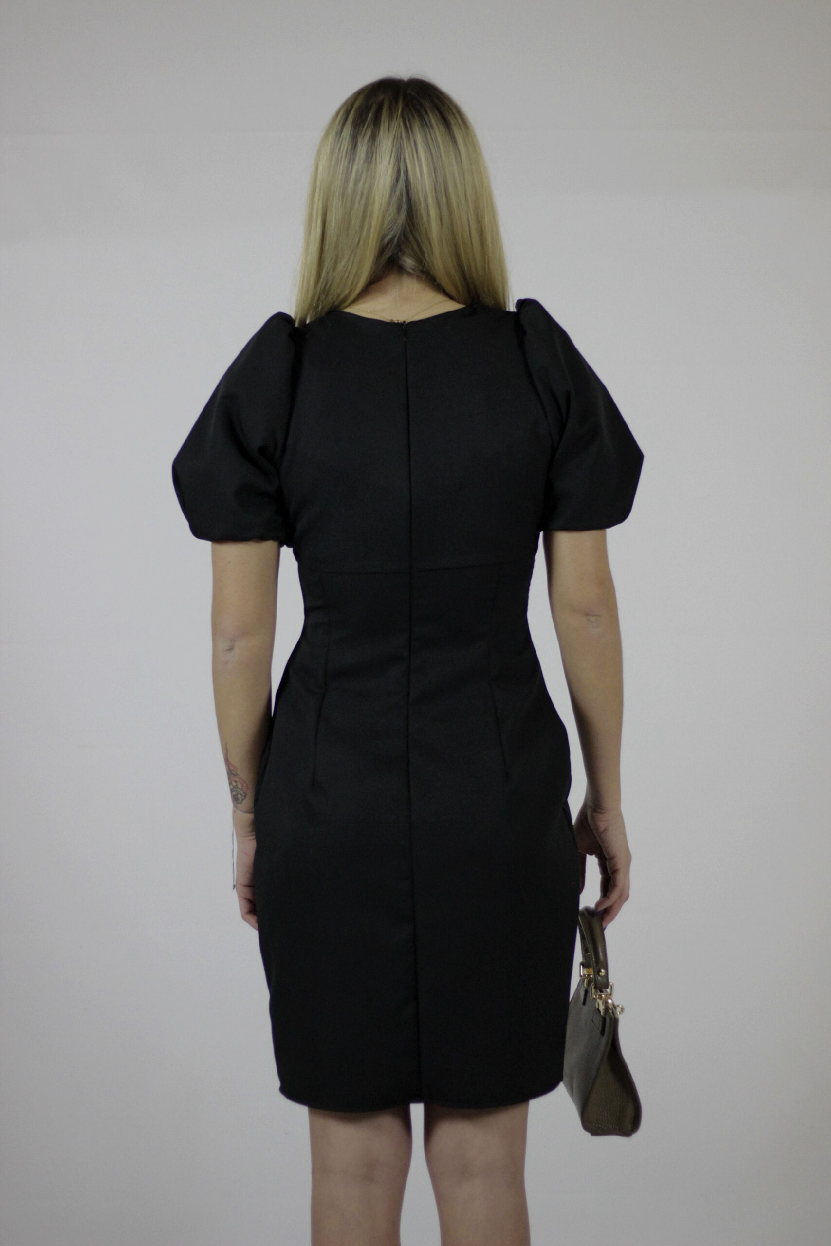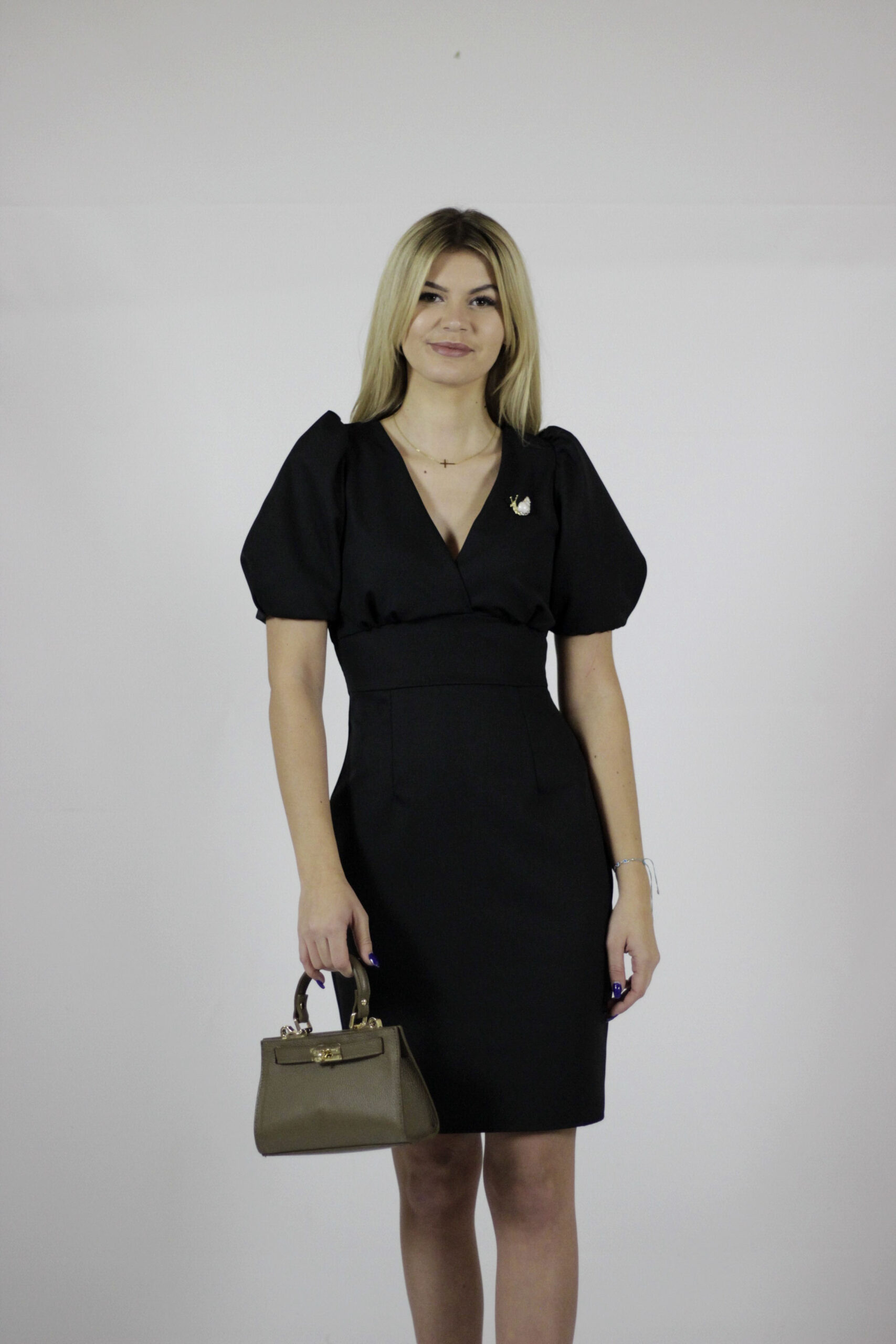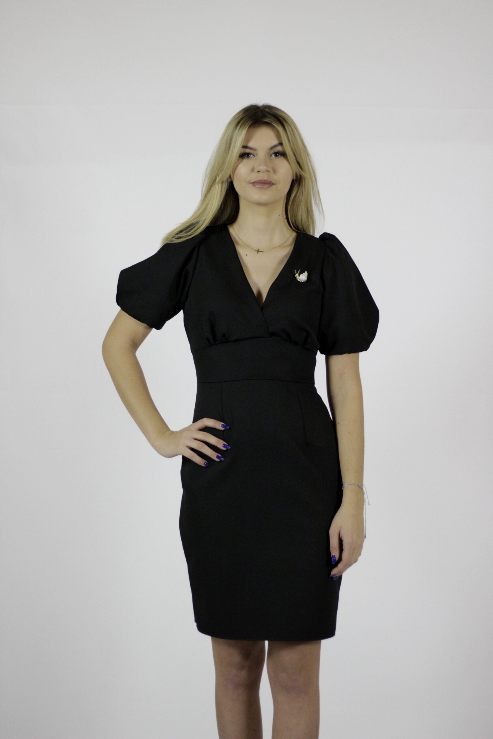 Wyjątkowa elegancka sukienka o długości midi w kolorze czarnym. Uszyta z miłej w dotyku dzianiny. Sukienka ma bardzo kobiecy krój , który optycznie podkreśla kobiecą figurę, kopertowy dekolt idealnie przylega do ciała, bufki, w talii wszyty szeroki pas dzięki czemu świetnie modeluje pas i kryje krągłości oraz ołówkowa spódnica z rozporkiem. Idealna propozycja na wyjście, do pracy, na wesele lub inne wyjątkowe okazje