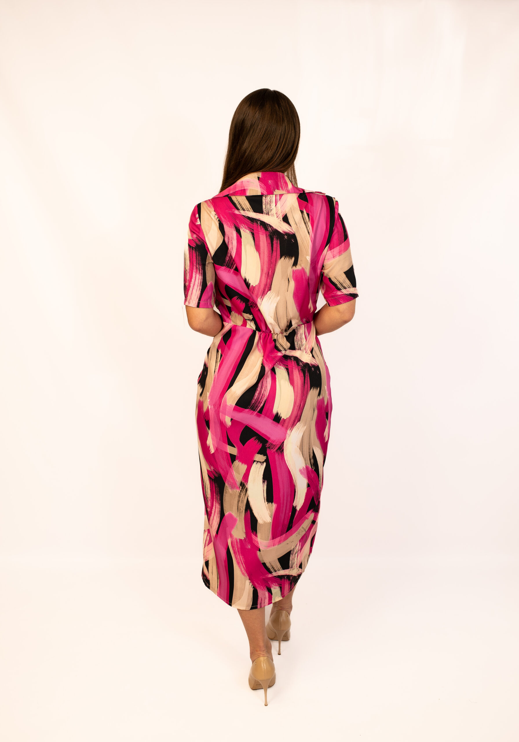 Sukienka w charakterny wzór, w różowo-czarnym kolorze. Model z kołnierzykiem, zapinana na guziki. Zawiązywana w pasie co pozwoli ukryć niedoskonałości. Wykonana z miękkiej tkaniny co zapewnia komfort noszenia. Idealna na różnego rodzaju okazje.