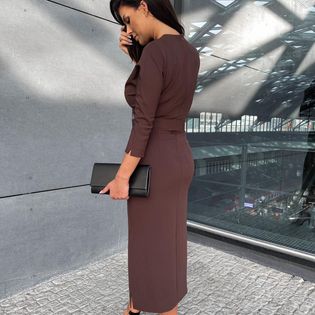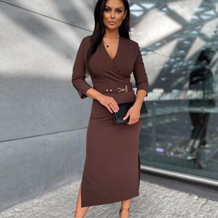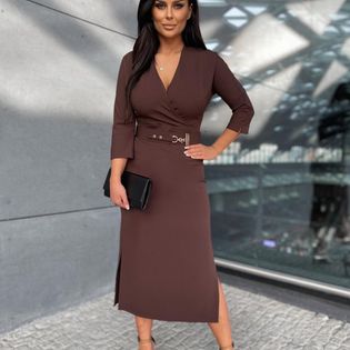 Kopertowa sukienka damska midi w eleganckim stylu. Sukienka z rękawami o długości 3/4 oraz ozdobną klamrą w linii talii. Model ten z pewnością sprawdzi się w wyjątkowych okazjach.