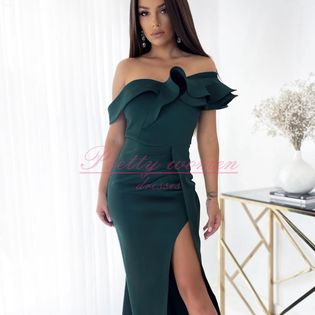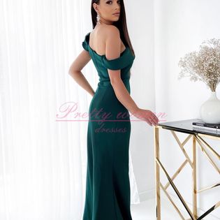 Długa sukienka w kolorze butelkowej zieleni, na jedno ramię. Góra sukienki jest ozdobiona falbanką, posiada wszyte miseczki. Sukienka zapinana jest z tyłu na kryty zamek. Model posiada na brzuchu marszczenia zakrywające wszelkie niedoskonałości. Kreacja idealnie sprawdzi się na ważne okazje.