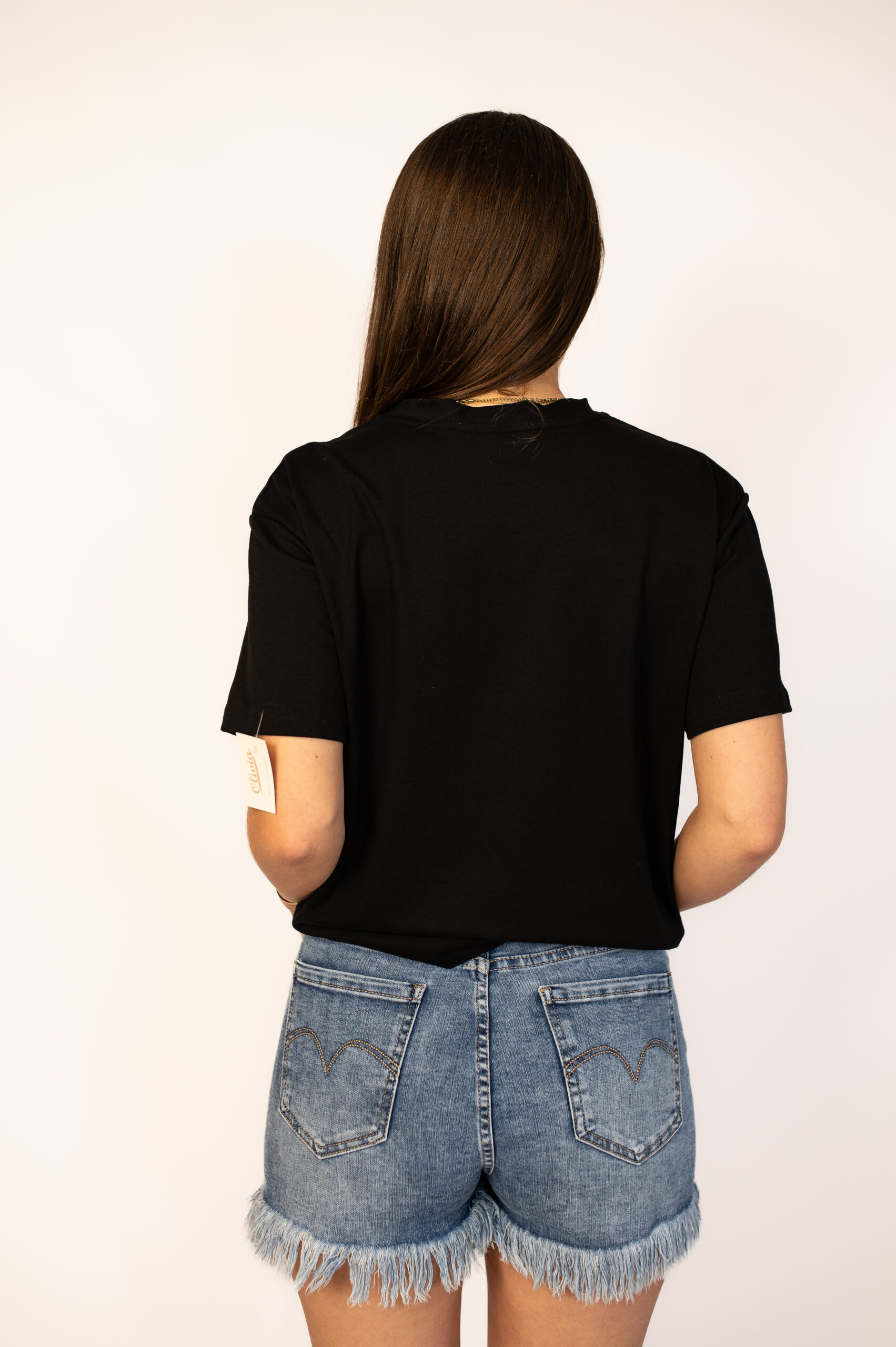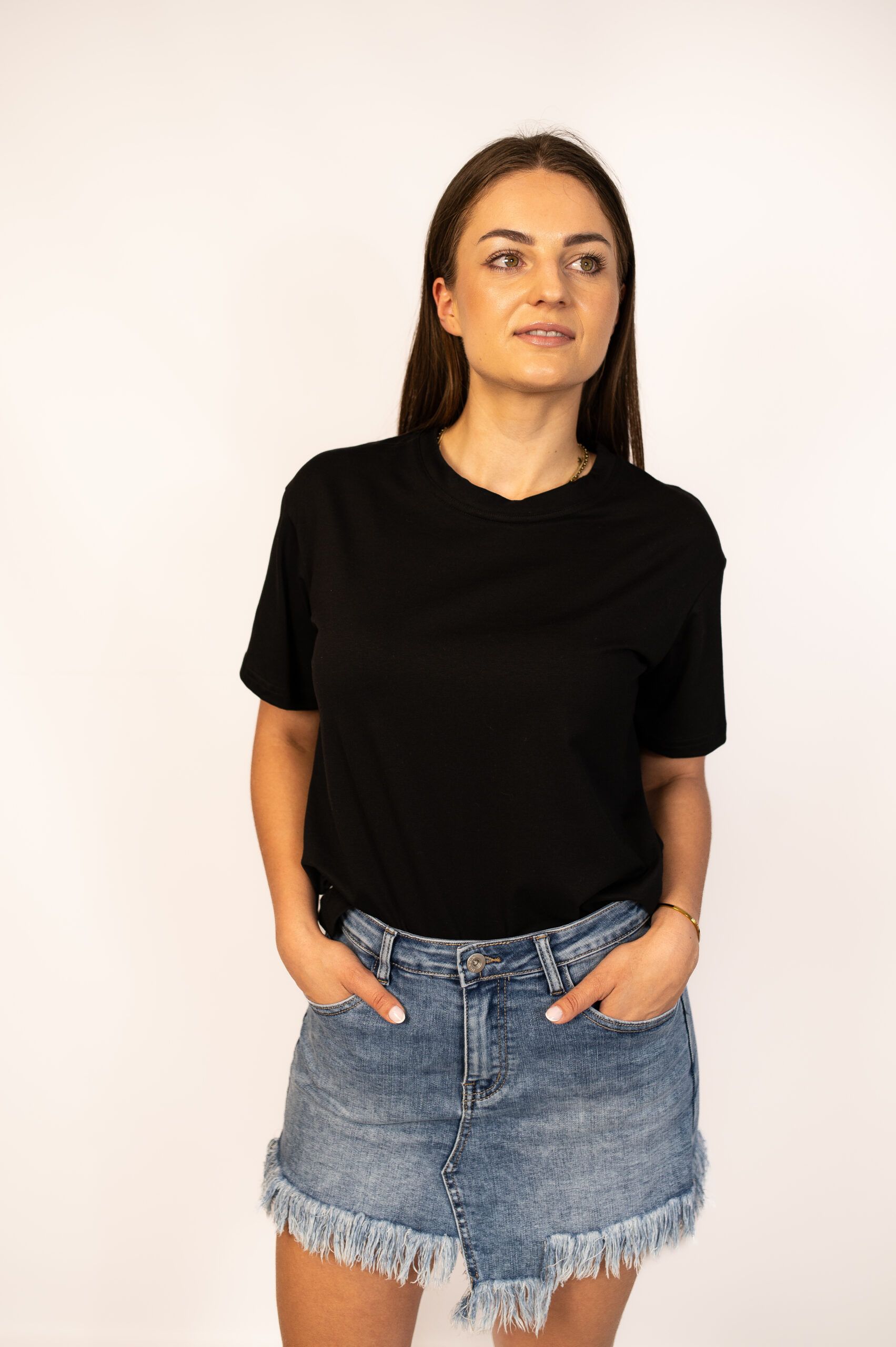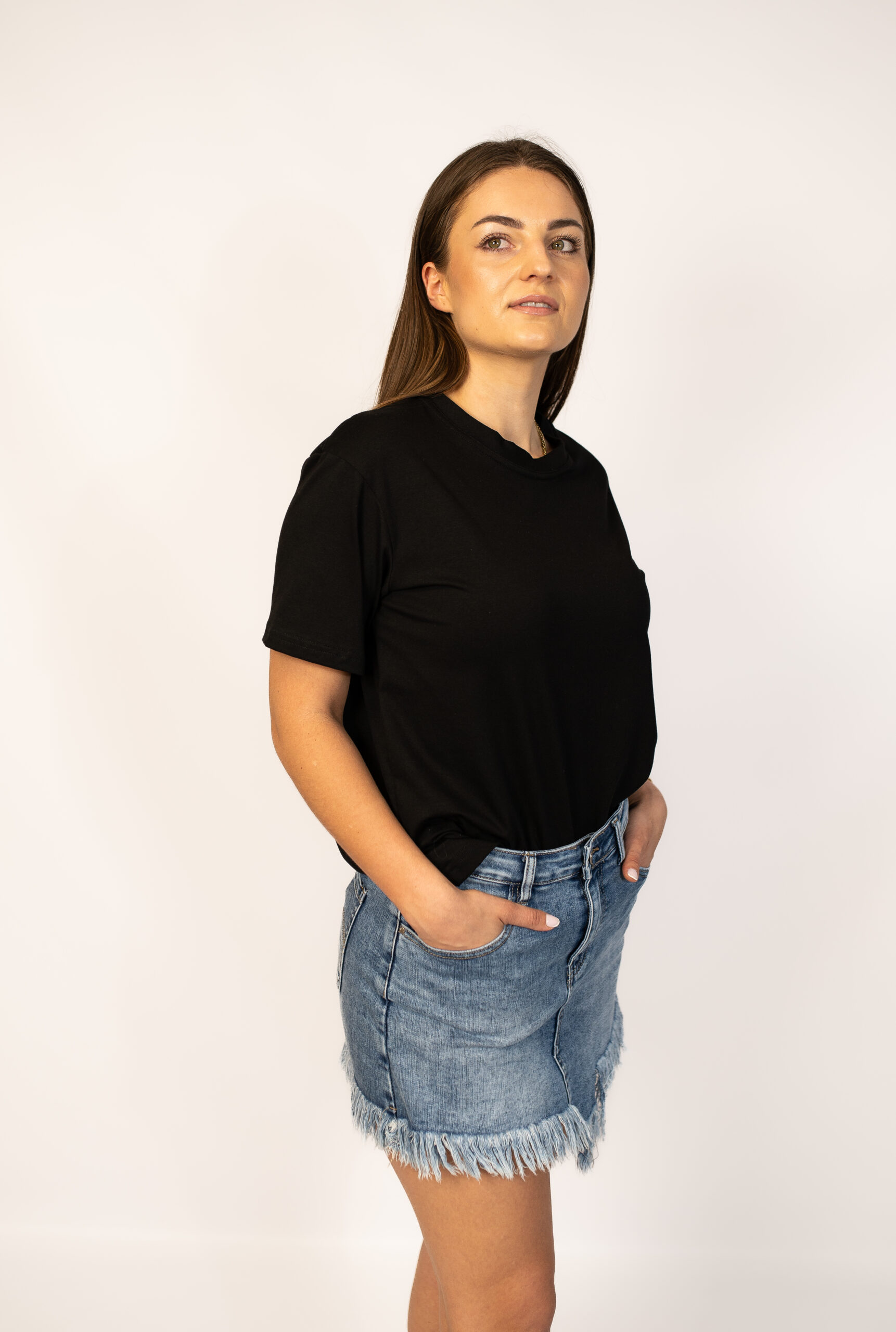 T-shirt o luźnym kroju w klasycznym czarnym kolorze. Model z okrągłym dekoltem. Koszulka będzie doskonała bazą do różnych stylizacji.